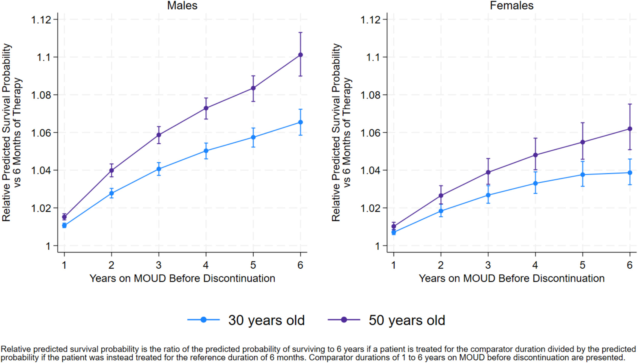 CAPTION: Relative Predicted 6-Year Survival Probability by Treatment Duration for 30- and 50-Year-Old Male and Female Reference Participants